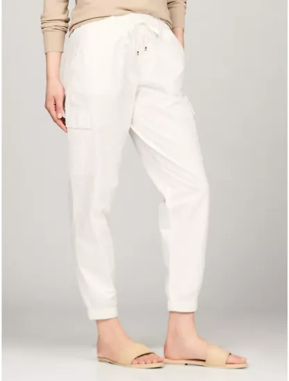 - Elastic drawstring waist, high waist, side slash pockets, back welt pockets, cargo pockets at the legs, elastic cuffs.