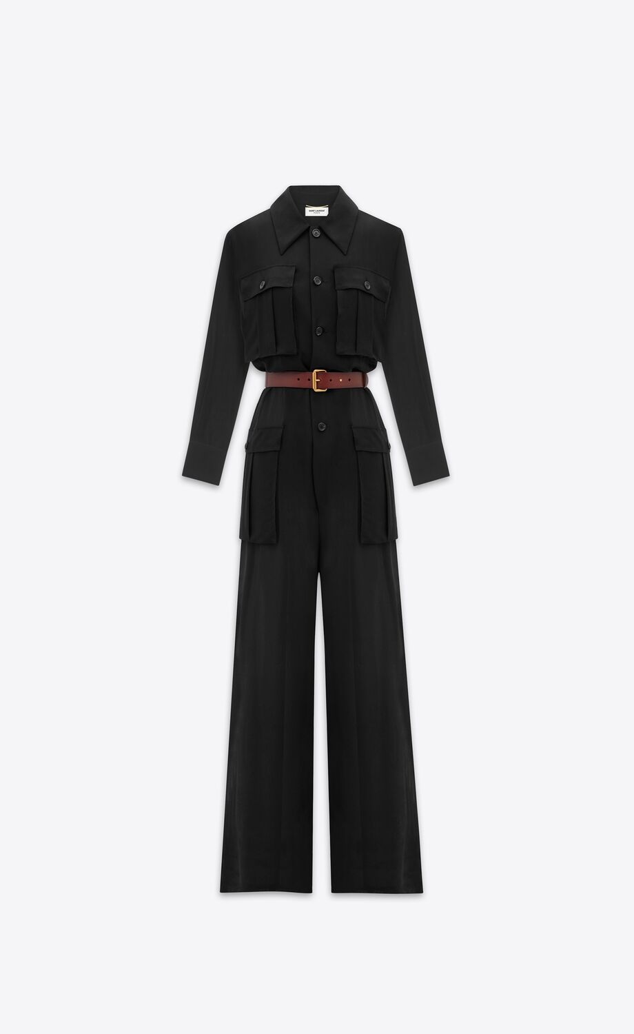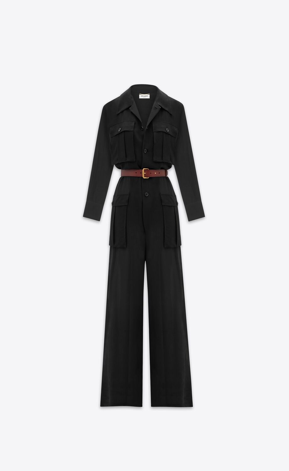 SEMI-SHEER BELTED JUMPSUIT MADE WITH ORGANIC SILK, FEATURING A LONG-SLEEVE TOP WITH PADDED SHOULDERS AND FLAP POCKETS, AND WIDE-LEG PANTS WITH A SIDE SLIT.